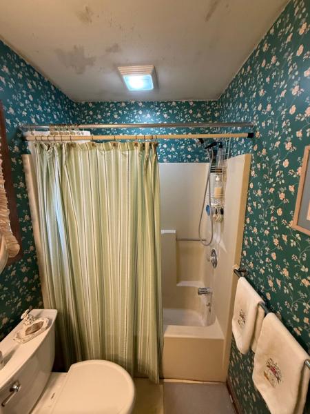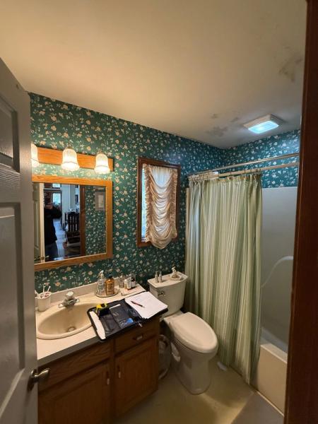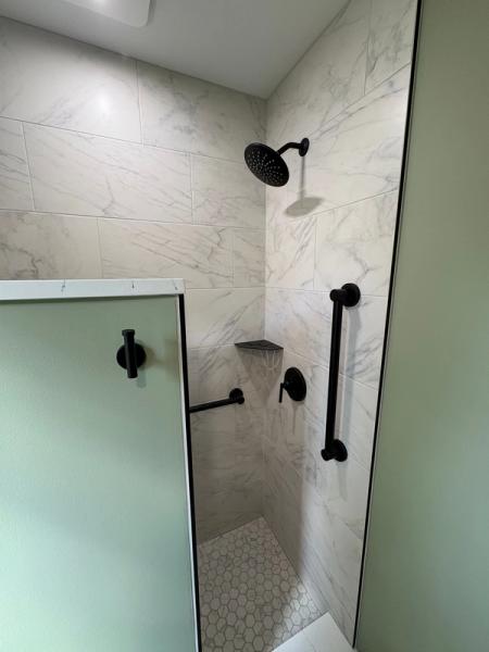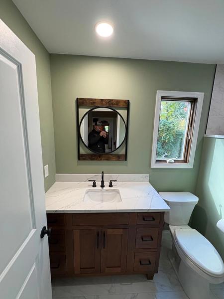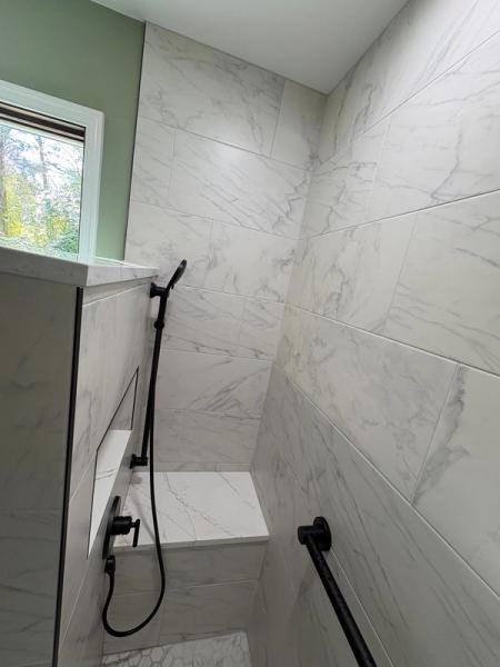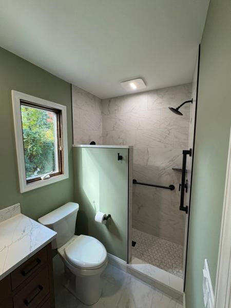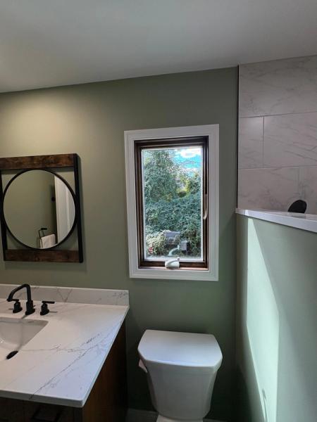 What started as a dated, wallpaper-heavy bathroom with worn fixtures is now a bright, modern, and welcoming space. We completely reimagined the room with a custom tile shower featuring marble-look walls, matte black fixtures, and a sleek glass panel that opens up the layout. The new warm wood vanity and quartz countertop add richness and contrast, while the soft green walls bring a calming, spa-like feel. Updated lighting, fresh flooring, and clean trim details pull everything together and give the bathroom an entirely new life.